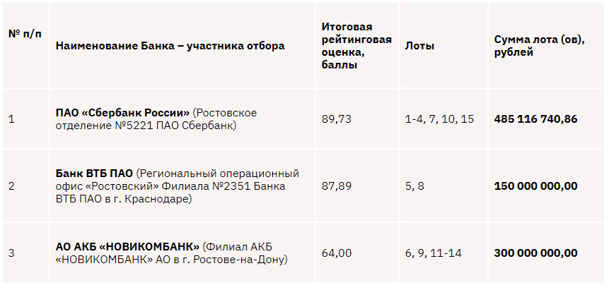 Итоги отбора банков для размещения временно свободных денежных средств некоммерческой организации «Гарантийный фонд Ростовской области» во вкладах (депозитах) от 15.06.2020