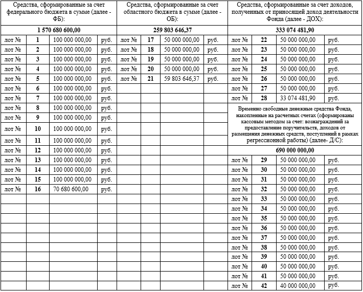 Суммы и лоты отбора: в общей сумме – 2 853 558 728 (два миллиарда восемьсот пятьдесят три миллиона пятьсот пятьдесят восемь тысяч семьсот двадцать восемь рублей) 27 копеек.