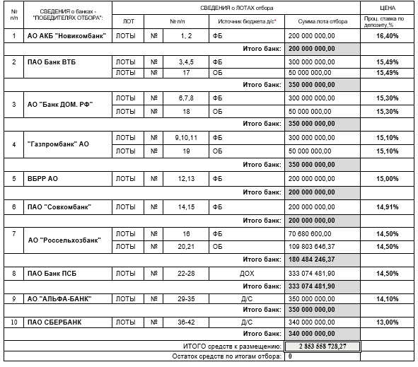 Коллегиальным советом принято решение распределить лоты отбора на основании предложения депозитной ставки, с учетом наличия свободного лимита для размещения средств на условиях, согласно поданной заявке на участие в депозитном отборе и разместить денежные средства НКО «Гарантийный фонд РО» в следующем порядке: